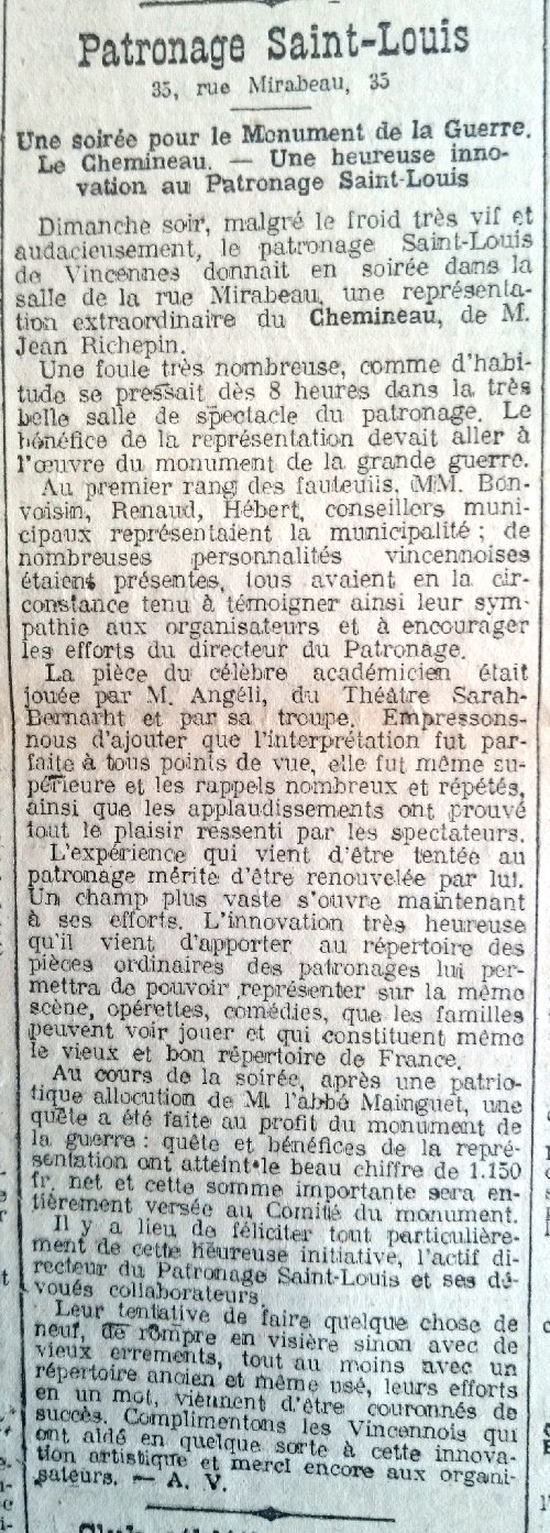 Dès le début des patronages, le théâtre a été utilisé comme outil d'éducation des jeunes. Aujourd'hui on peut se perfectionner en suivant des séminaires de communication orale, mais à l'époque, les patronages donnaient aux jeunes la possibilité de faire des progrès en interprétant des oeuvres théâtrales. Des outils étaient même disponibles, outils qu'on trouvait dans des publicités comme celle qu'on a pu lire dans le numéro du 1er janvier 1920 du journal La Vie au Patronage, organe catholique des oeuvres de jeunesse.